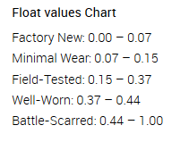 Не все скины в игре выглядят самыми чистыми, для каждого скина есть пять разных видов скинов. Скин «Прямо с завода» выглядит самым новым с наименьшим количеством царапин, в то время как скины с закаленной в боях одеждой больше всего порваны с большим количеством царапин. Когда вы наводите курсор на скин в своем инвентаре, он должен сказать вам, сколько на нем надето. Поплавок кожи — это то, насколько она изношена. На картинке выше показано, насколько кожа может быть изношена в каждой категории. Чем выше число с плавающей запятой, тем больше избит скин. Чтобы найти поплавок вашей кожи, щелкните его правой кнопкой мыши в инвентаре и нажмите кнопку «осмотреть». После этого в левом нижнем углу должна быть небольшая буква «i» для получения дополнительной информации, после чего вы сможете увидеть число с плавающей запятой.