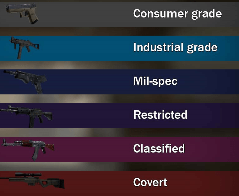 Есть шесть различных раритетов скинов для вашего оружия. Просто чтобы уточнить, оружие на картинке выше не имеет ничего общего с раритетами; вы можете получить скин любой редкости с любым оружием. Потребительский класс (серый) — самый распространенный дроп, а тайные (красные) скины — самые редкие и дорогие. Скины Потребительского и Промышленного класса не входят в оружейные кейсы, прилагаются только Mil-spec (синий), Restricted (фиолетовый), Classified (розовый) и Covert (красный). Если вам действительно повезет, вы можете получить желтый, который дает вам ножи или перчатки. Если вы получили желтый, вы выиграли джекпот CSGO. Они реже и дороже, чем большинство скинов оружия, даже красных.