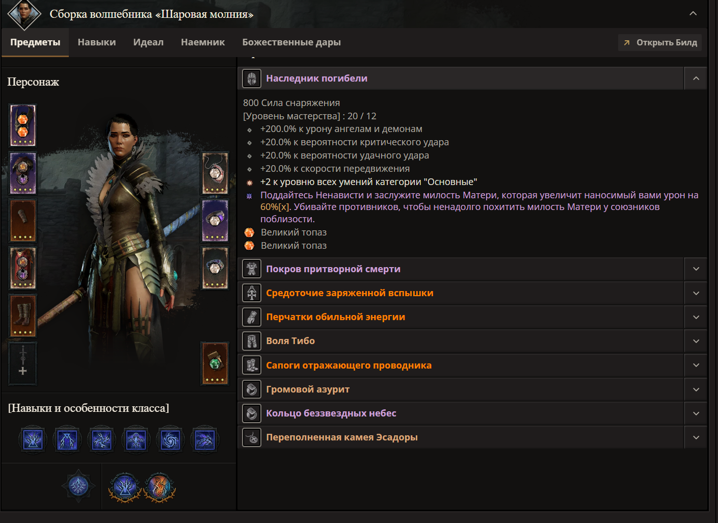Приоритетные характеристики: Ранг навыков (особенно Шаровой молнии), шанс критического удара, скорость атаки. Для поддержания маны необходим Аспект перезарядки.