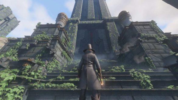 Поднимитесь по лестнице и прямо внутрь. Встаньте и «Используйте» светящуюся красную площадку телепорта. Это приведет вас наверх и внутрь башни, начиная загадку. Когда вы войдёте во внутреннее пространство, вы увидите небольшую лестницу впереди и справа. Поднимитесь по лестнице на вершину небольшой платформы. Посмотрите на юг и вы увидите дверь на другой стороне комнаты. Перепрыгните и нажмите E, чтобы с помощью крюка перемахнуть через дверь.