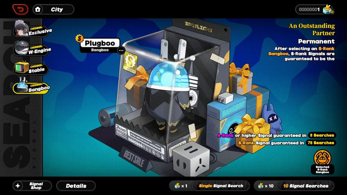 Plugboo доступен на канале Bangboo и может быть выбран в качестве гарантированного S-ранга. Plugboo нельзя извлечь из стабильного канала, эксклюзивного канала или канала W-Engine. При выборе Plugboo будет указано «100% UP», чтобы вы знали, кого выбрали.