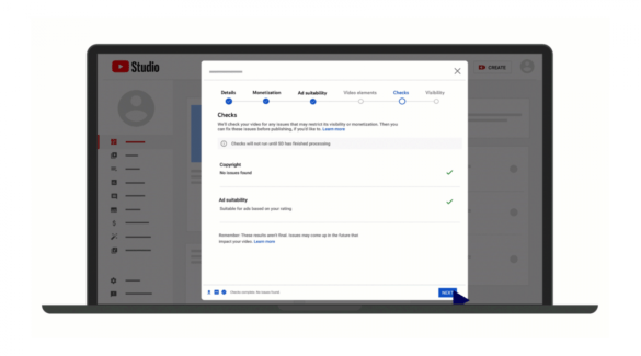 Проверки можно найти в потоке загрузки Studio на YouTube, что позволяет создателям сканировать жалобы на авторские права и проблемы с рекламой в качестве последнего шага перед выбором видимости видео.