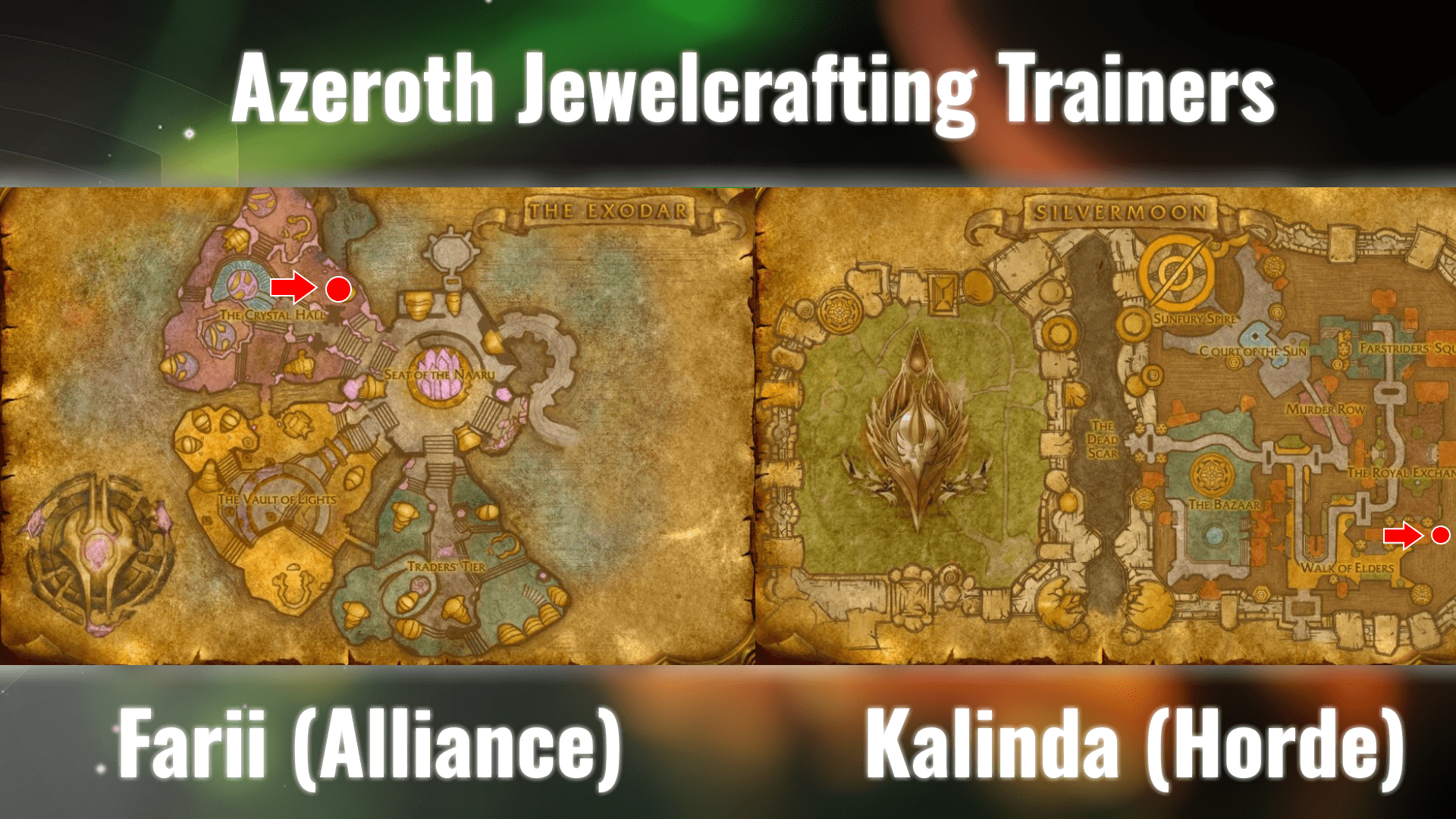 - Тренеров по ювелирному делу можно найти в Эксодаре, Сильвермун-Сити и Запределье. Навыки с 1 по 375 можно прокачать в Запределье; для прокачки навыков выше 300 требуется 50-й уровень и 275-й навык.