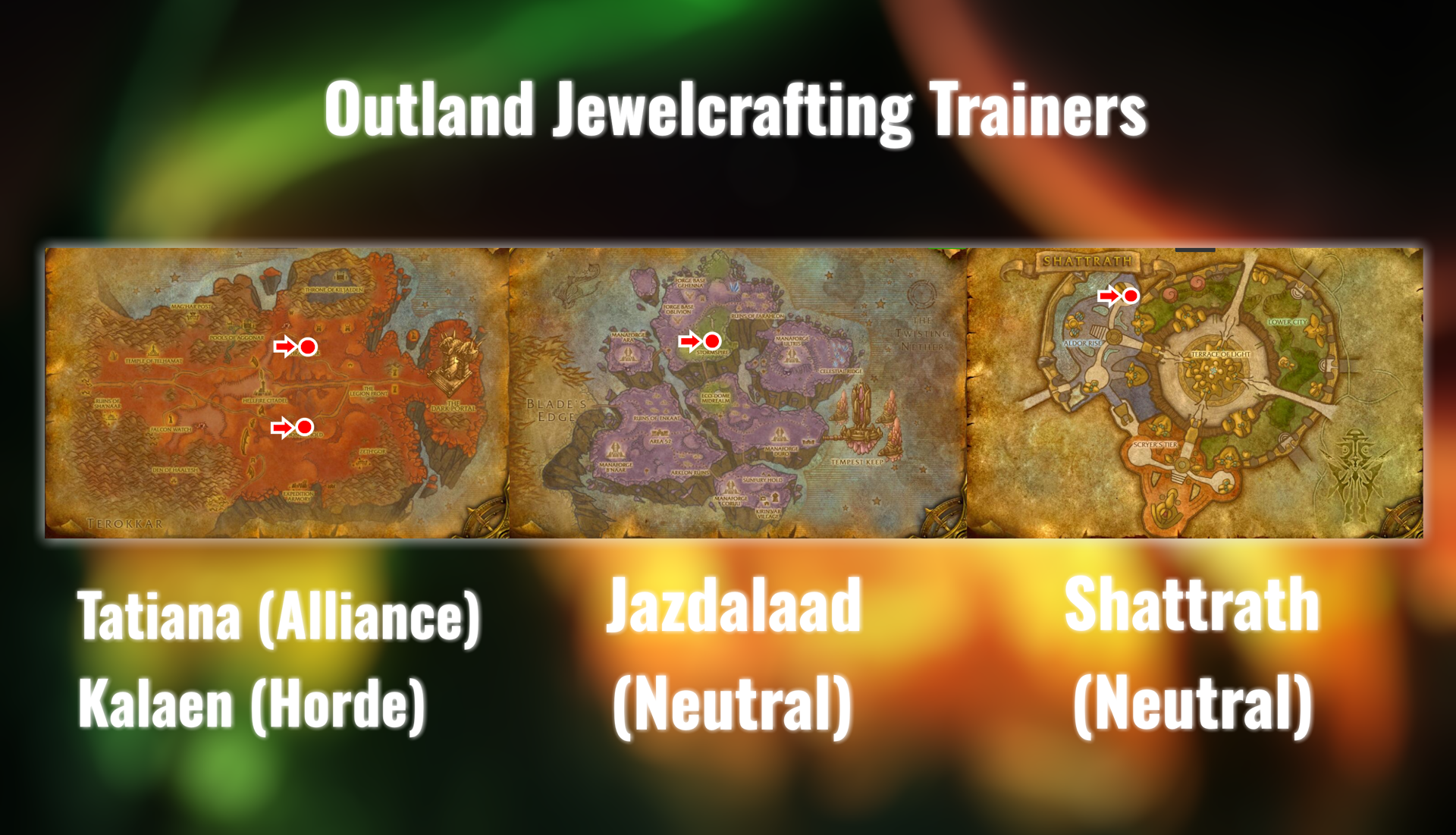 В Азероте тренеры по ювелирному делу доступны только в новых локациях, добавленных в дополнении The Burning Crusade. Вот список тренеров Азерота, которые могут обучить вас ювелирному делу с 1 по 300 уровень в юбилейном дополнении TBC:| Расположение | Тренер | Фракция | Координаты |