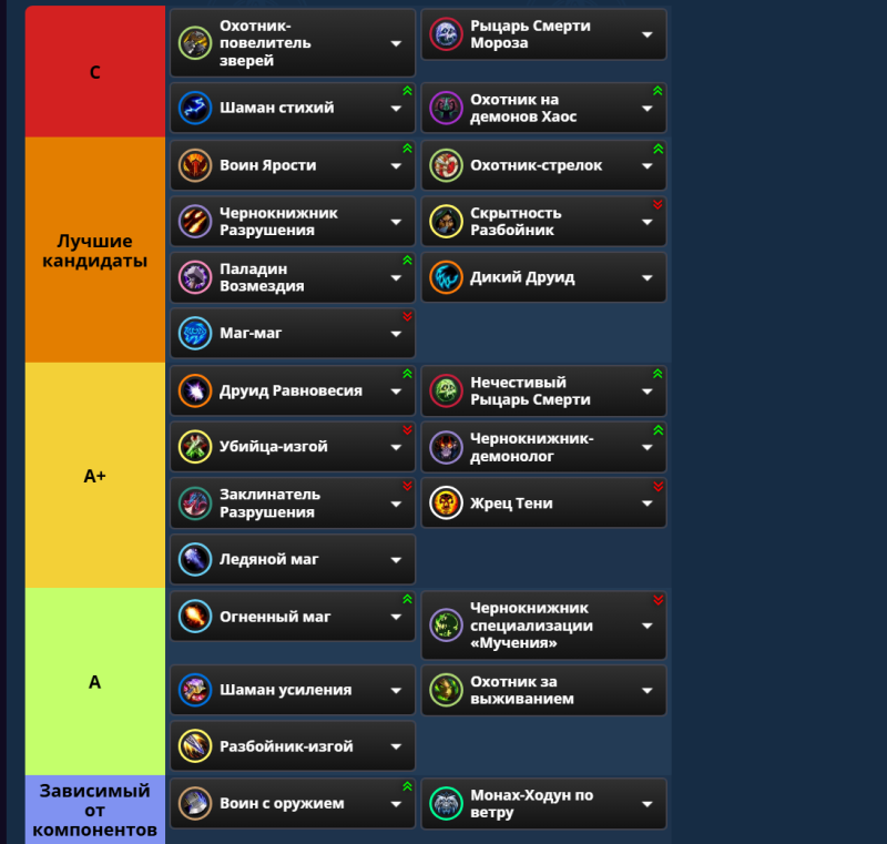 Этот рейтинг НЕ ЯВЛЯЕТСЯ ОКОНЧАТЕЛЬНЫМ; он будет меняться и регулярно обновляться в течение 3-го сезона TWW. Часто происходят изменения в рейтингах и настройках классов, а также изменения талантов и масштабирования вторичных характеристик, которые влияют на место специализаций в списке.
